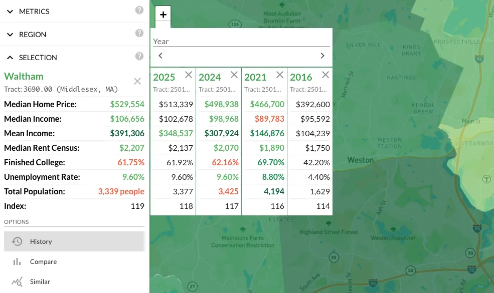 Gentrification follows a recognizable multi-year pattern: rising home values, increasing educational attainment, shifting age demographics toward younger professionals, growing household income. These signals don't appear overnight. They build over a 5-10 year window, often starting slowly and accelerating as the neighborhood tips. Metrics History makes this pattern visible in a single view. I wrote about gentrification detection in detail elsewhere, but this is the tool that makes the signals tangible rather than theoretical.