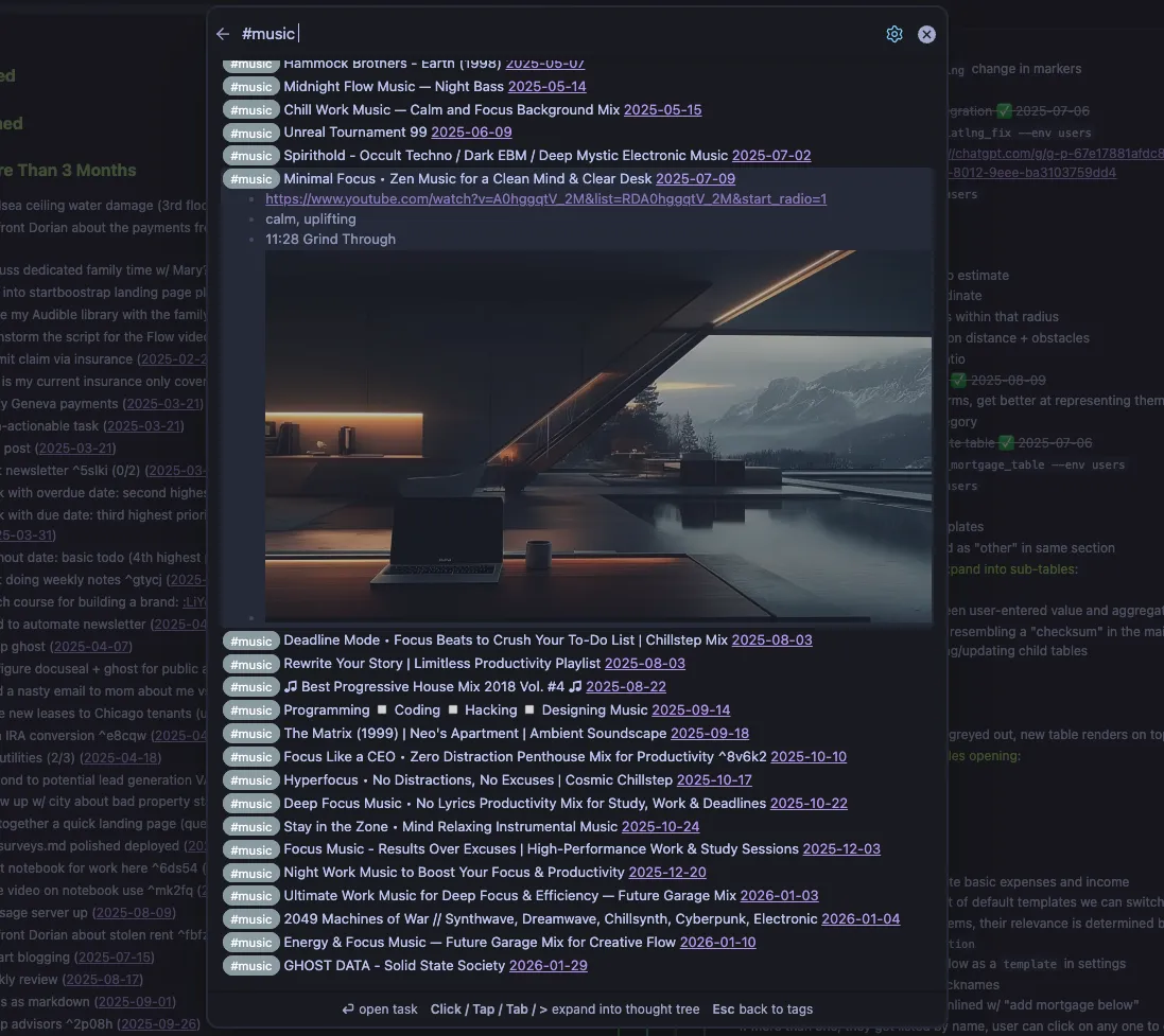 I think there are fundamentally two approaches to organization. The first is the filing system: you organize things ahead of time so you know where to find them later. Traditional, tedious, and the default approach of most productivity tools. The second is the search engine: you throw everything into one location (David Allen calls this the inbox basket in Getting Things Done) and build a system that auto-organizes it. I went with the second approach. My daily routine is simple: take notes. Anything I want tracked goes into the notebook. Missing a day is fine. I don't organize my notes when I write them, I tag them. A #blog tag means this idea should become a post. A #todo tag means it's something I need to do. The tags are the only structure I impose, and the system handles everything else. The tags become digital "airtags" for my thoughts.