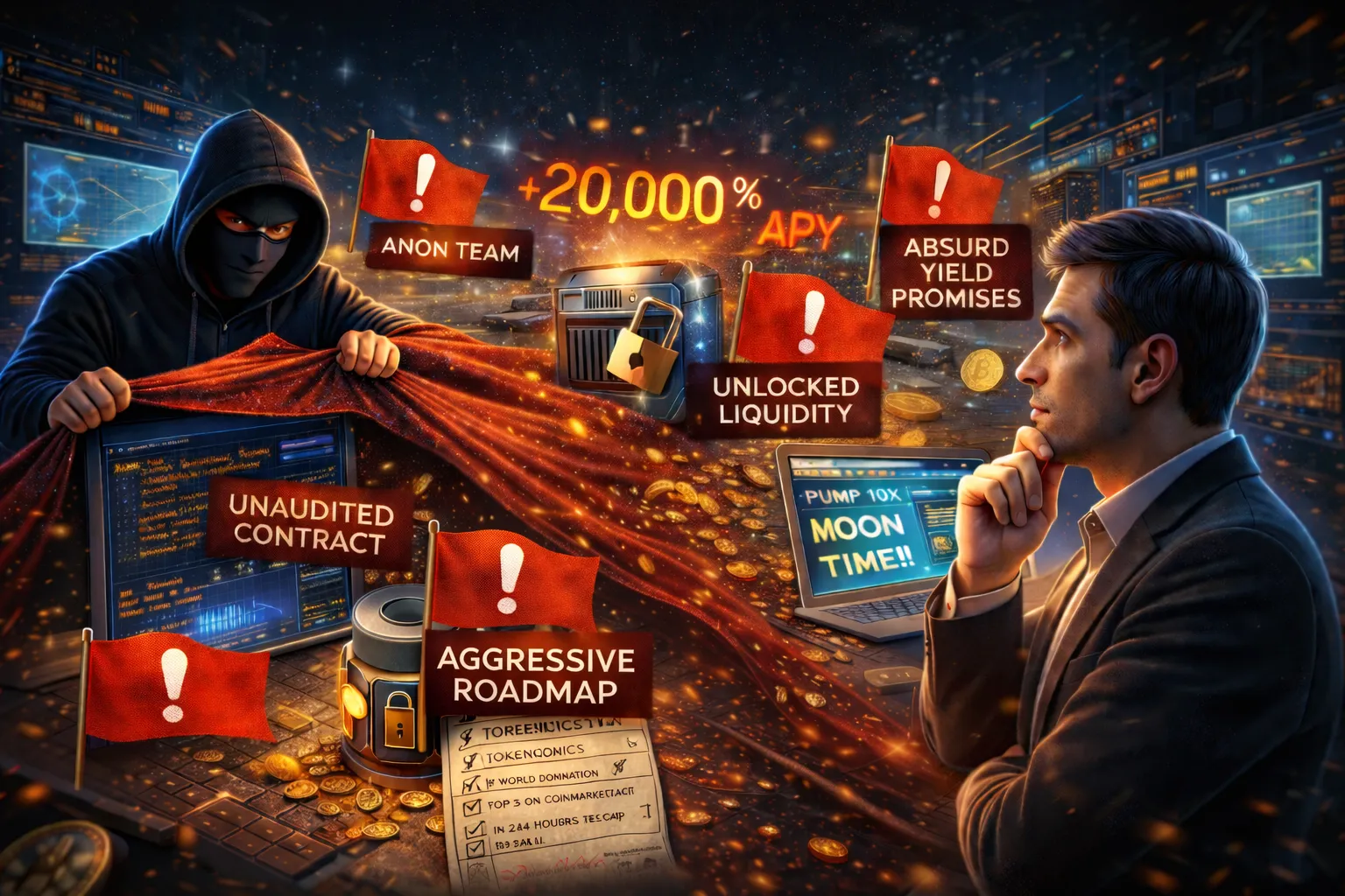 To avoid getting rug‑pulled, investors should watch for classic warning signs. Key red flags include:
