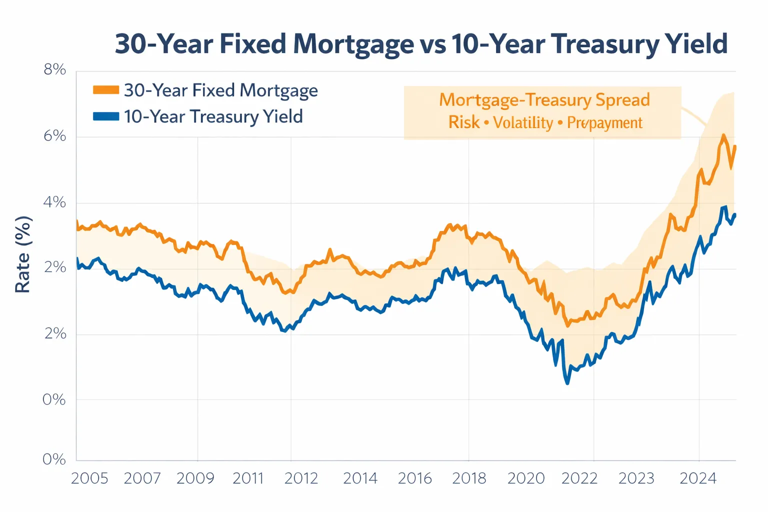 These dynamics explain why the Fed’s policy rate and 30‑year mortgage rates sometimes diverge dramatically. In late 2023, for example, the Fed funds rate hovered around 5.5%, yet 30‑year mortgages exceeded 7.5%. The gap reflected a combination of elevated 10‑year yields and wider mortgage spreads due to an inverted yield curve.